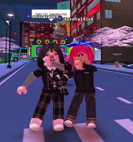 Roblox characters milcara228 and Xxsofia142xX dancing together in a city street, with a caption saying 'mouths closed'.