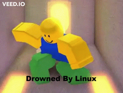 A Roblox character in a blue shirt and green pants is shown 'drowning' with the on-screen text 'Drowned By Linux'.