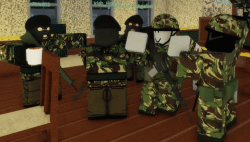 Roblox characters in military camouflage, depicting a scene from The Troubles, featuring Irish Republican Army members.