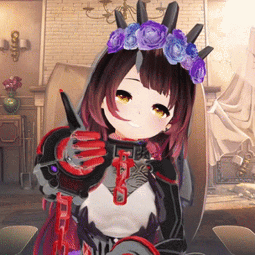Robocosan from Hololive smiles and gives a thumbs up, wearing a purple flower crown and a crown.