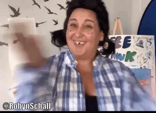 Robyn Schall's "Cawfee Tawk" character, a hillbilly with pigtails and missing teeth, claps happily.