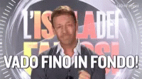 Rocco Siffredi making a determined statement, 'I go all the way!', in front of 'L'Isola dei Famosi' logo.