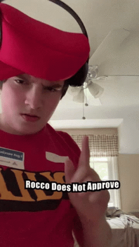 A person wearing a 'Rocco Does Not Approve' shirt makes a disapproving face, followed by another person's pout.