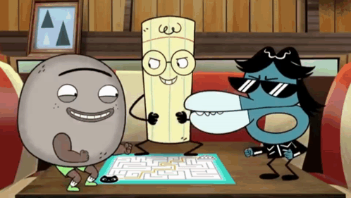 Three animated characters, including Rock, Paper, and Scissors, celebrate a game victory on a diner table.