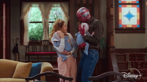 Wanda Maximoff and Vision from WandaVision lovingly hold their babies in a cozy living room scene.