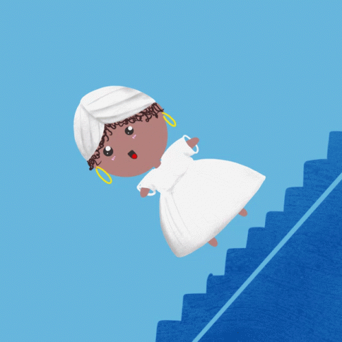 A cute cartoon character, a woman in a white dress, tumbles down a set of blue stairs.