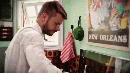 Rodrigo Hilbert cooking in a kitchen, with a 'New Orleans' poster visible on the wall.