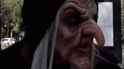 Rogergzz showcases a highly realistic and grotesque witch mask with a long nose and white hair.