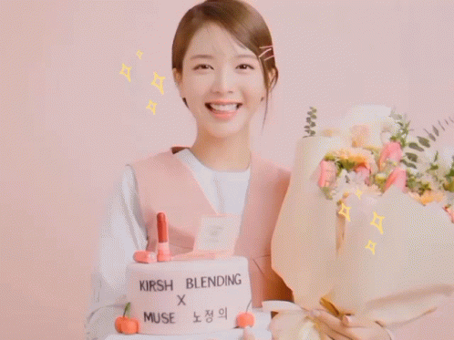 Roh Jeongeui smiles brightly, holding a bouquet of flowers and a cake with a 'Thank you' message.