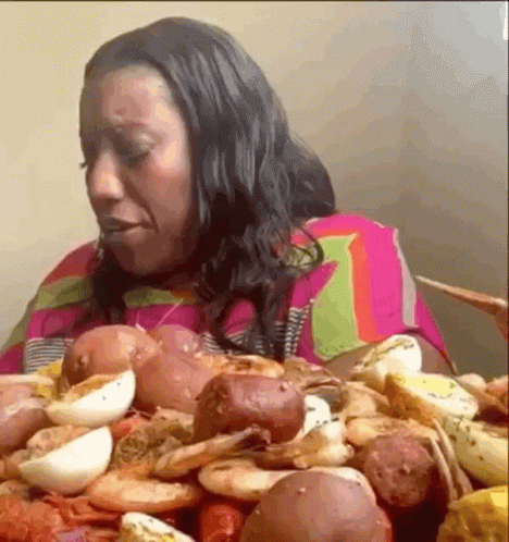 Forreal Felicia from Rokeitup enjoys a massive seafood boil with shrimp, potatoes, and eggs.