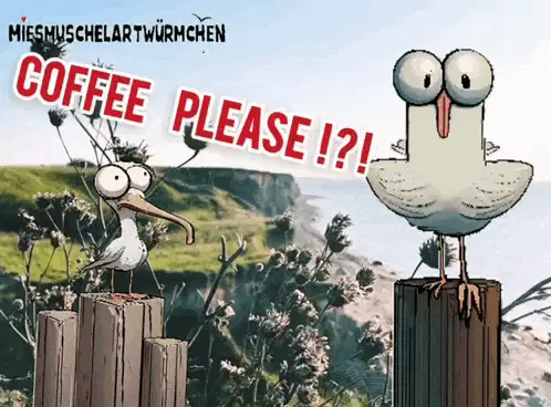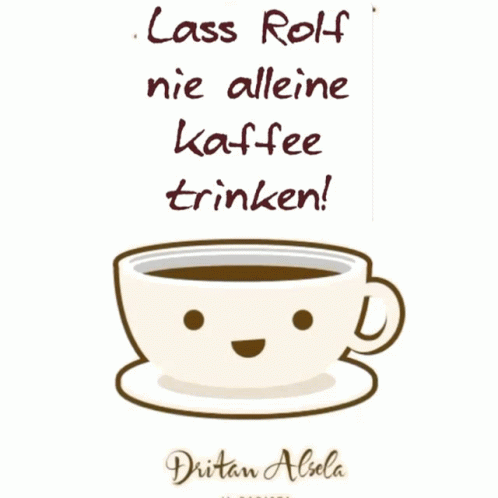 Cartoon coffee cup with winking face and heart, text 'Lass Rolf nie alleine Kaffee trinken!' (Never let Rolf drink coffee alone!).