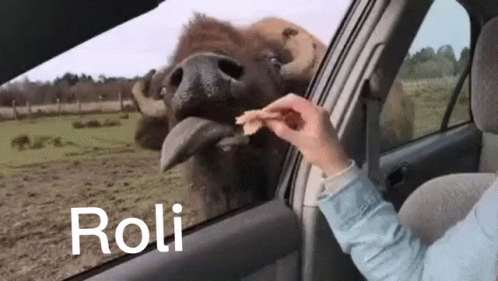 A person feeds Roli the cow from a car window, as the animal sticks out its tongue to eat.