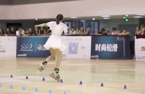 A woman in a white dress performs impressive slalom inline skating maneuvers at a competition.