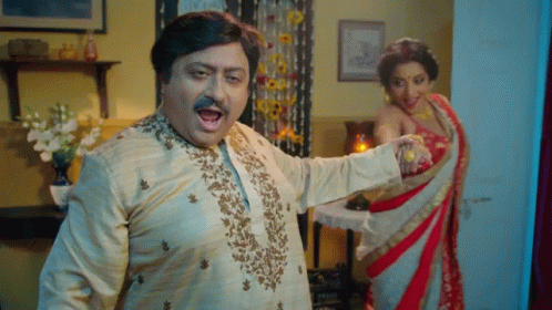 A man and woman from the Bengali web series Dupur Thakurpo are seen hilariously dancing together in a romantic comedy scene.