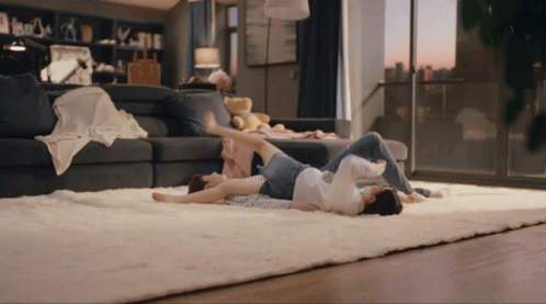 Zhao Lusi and Terry Liu playfully rolling on a rug in a living room from 'Please Feel At Ease Mr Ling'.
