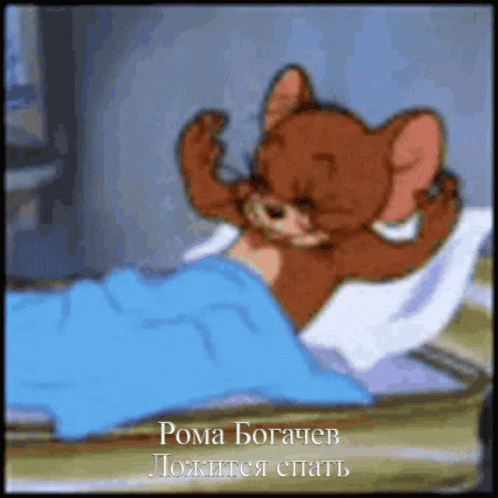 Roma Bogachev, depicted as Jerry from Tom and Jerry, stretches and relaxes in bed, ready for sleep.