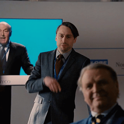 Roman Roy delivers an animated presentation, gesturing expressively in a corporate setting from the series Succession.