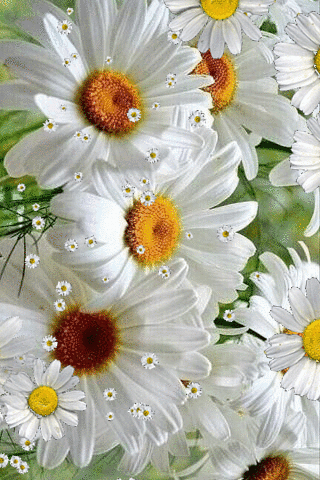 An animated display of white daisies with yellow and orange centers, featuring smaller daisies floating around.