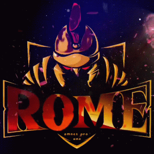 Animated logo for Rome, featuring a stylized knight helmet and the motto 'omnes pro uno' against a cosmic background.