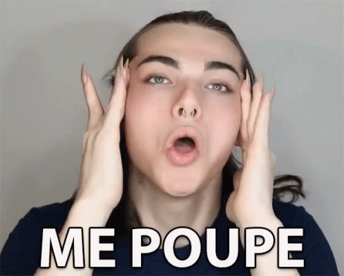 Romolo Cricca makes expressive faces while mouthing 'Me Poupe', holding his face with his hands.