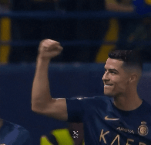 Cristiano Ronaldo celebrates a goal in his Al Nassr jersey, showing his signature triumphant pose.