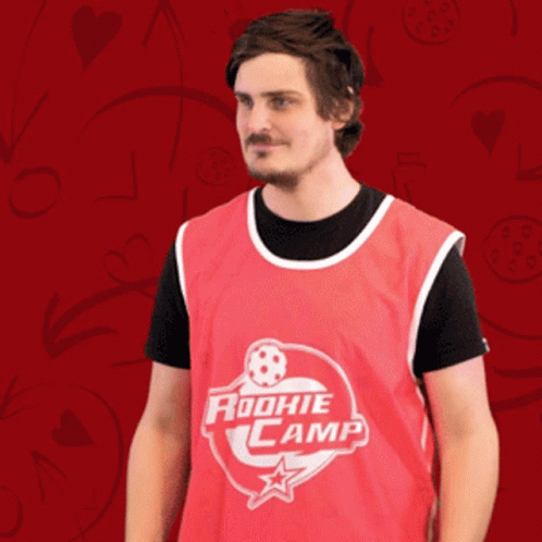 Man in a red Rookie Camp jersey showing funny and expressive reactions.
