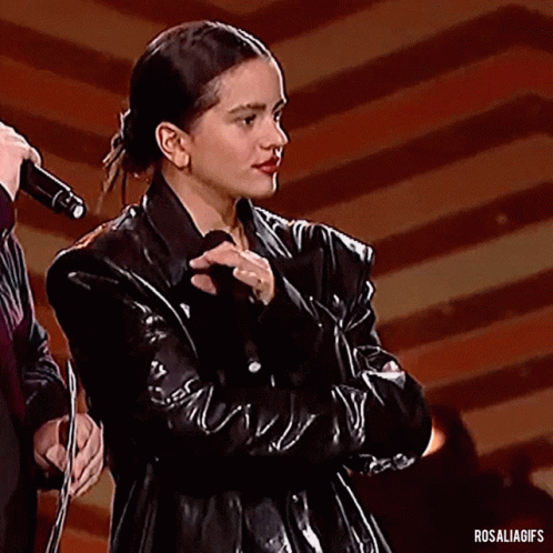 Rosalía on stage, wearing a black leather jacket, speaking and gesturing with a microphone.