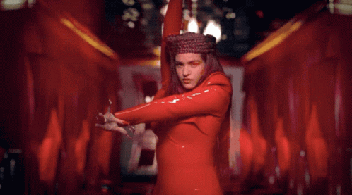 Rosalia in a red latex dress performing a dynamic dance, reminiscent of the WAP style, with intense gaze.