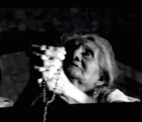 In a grainy black and white clip, people are seen praying, holding rosaries in their hands.