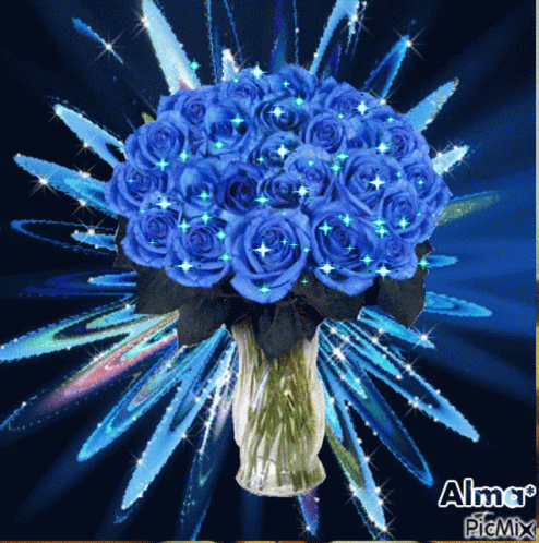 A vibrant bouquet of sparkling blue roses in a vase, set against a dynamic blue background with glitter effects.