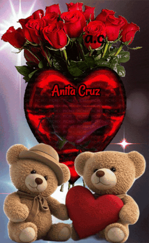 Two teddy bears holding a heart, with a bouquet of red roses and the name Anita Cruz on a heart-shaped vase.