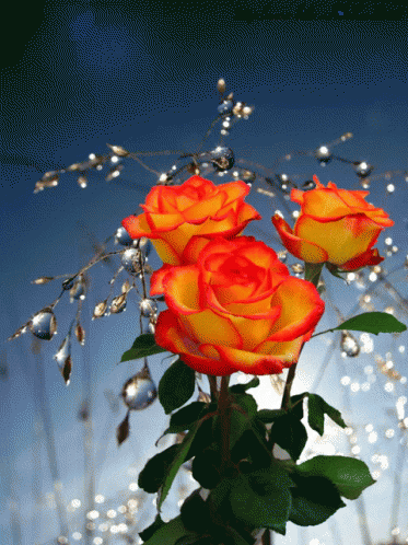 Three vibrant yellow and red roses bloom against a sparkling, color-changing background with dewdrop-like elements.