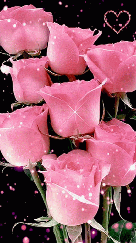 A beautiful bouquet of sparkling pink roses with glitter effects and a glowing heart against a dark background.