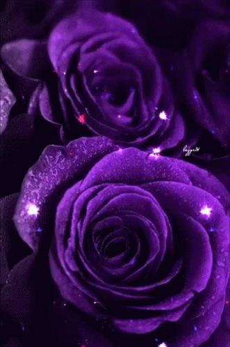 Vibrant purple roses adorned with sparkling glitter and delicate water droplets.
