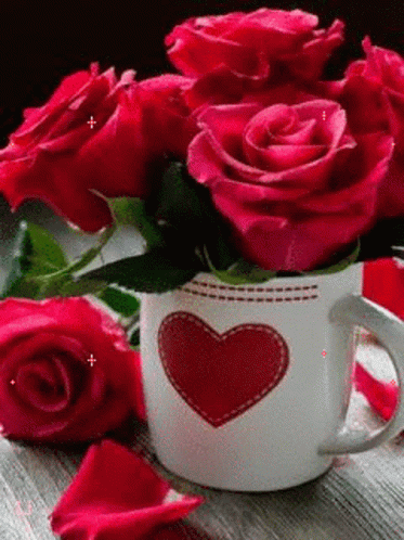 A charming white mug with a red heart design, filled with vibrant red roses, with petals scattered nearby.