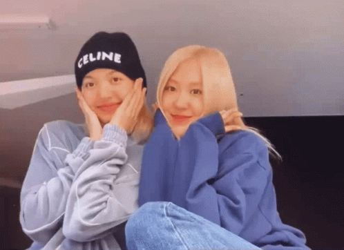 BLACKPINK's Rosé and Lisa share a sweet moment, cuddling and smiling warmly for the camera.