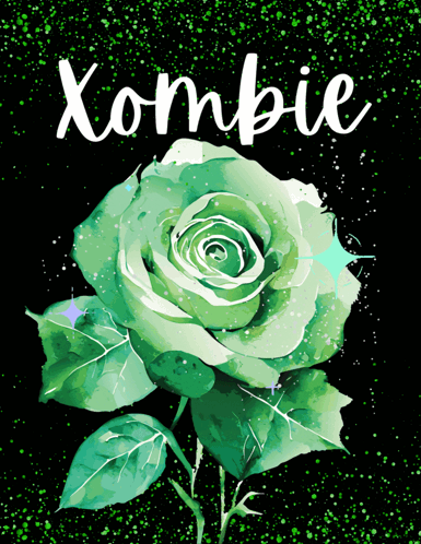 A vibrant green rose with the word 'Xombie' above it, set against a sparkling black background.