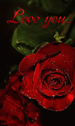A beautiful glittering red rose adorned with water droplets, featuring a heartfelt 'Love you' message.
