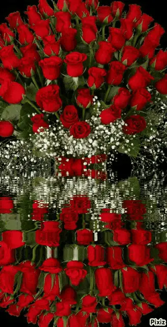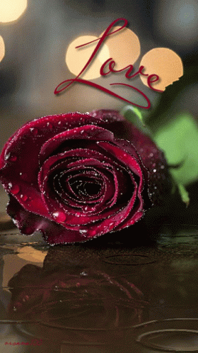 A beautiful, dewy red rose with the word 'Love' elegantly written above it, reflecting on a surface.