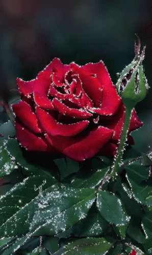 A vibrant red rose bloom, adorned with sparkling dew drops, showcasing its intricate petals and a budding companion.