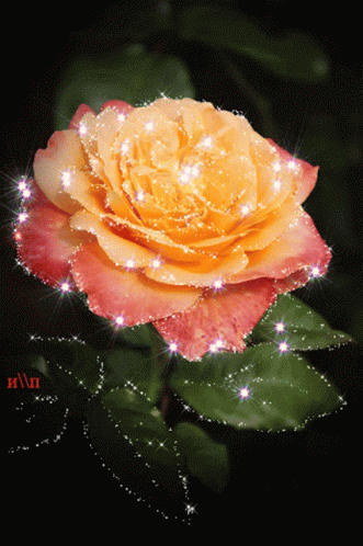 A beautiful yellow and pink rose, adorned with sparkling glitter, stands out against a dark background.