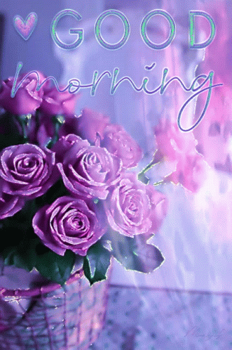 Beautiful purple roses with a sparkling glitter effect, wishing a 'Good Morning'.