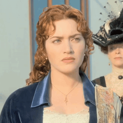 Rose DeWitt Bukater (Kate Winslet) from Titanic, with her iconic red curly hair and elegant attire, looks thoughtfully into the distance.