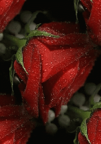 A vibrant red rose bud covered in glistening water drops, set against a dark, romantic background.