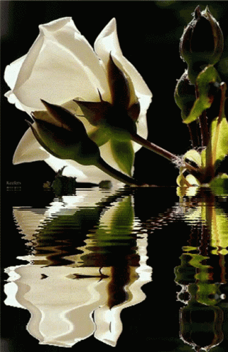 A beautiful white rose and its buds are elegantly reflected in calm water, creating a serene visual.