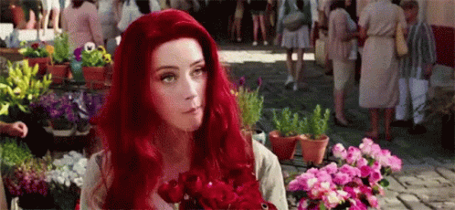Amber Heard as Mera, with vibrant red hair, holds a bouquet of red roses in a market scene from Aquaman.