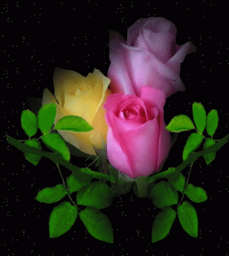 A beautiful arrangement of pink, yellow, and lavender roses with green leaves, set against a sparkling black background.