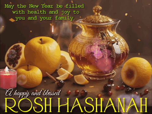 A happy and blessed Rosh Hashanah greeting with traditional fruits, honey, and candles.