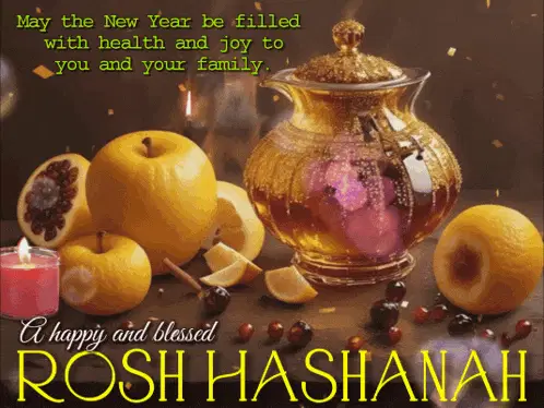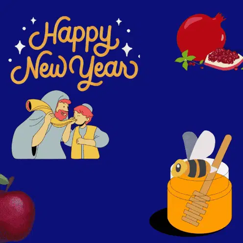 A vibrant Rosh Hashanah greeting card featuring honey, apples, a shofar, and wishes for peace and prosperity.