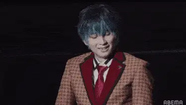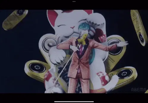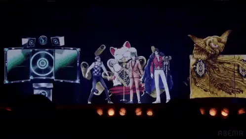 two men standing on a stage in front of a large screen that says abema